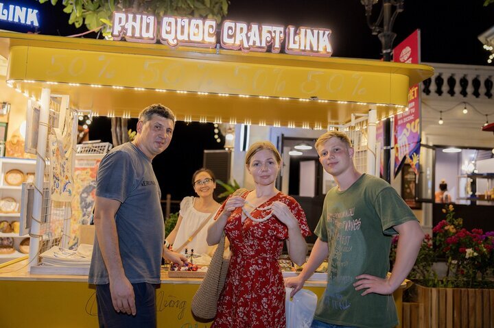 Located in the VUI-Fest Bazaar—the first beachfront night market in Vietnam—open daily from 4:00 PM to midnight, Phu Quoc Craft Link stands out with its lush atmosphere and unique products, attracting the attention of many visitors to this lively market.