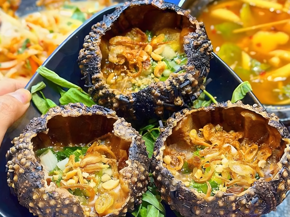 Nhum nướng mỡ hành là món ăn khiến thực khách mê mẩn ngay từ lần đầu thưởng thức. Nhum, hay còn gọi là cầu gai, là loại hải sản đặc trưng của vùng biển Phú Quốc, thường xuất hiện nhiều vào mùa khô. Khi được nướng trên than hồng, lớp thịt nhum dậy mùi thơm béo ngậy, phảng phất hương vị mặn mòi của biển.