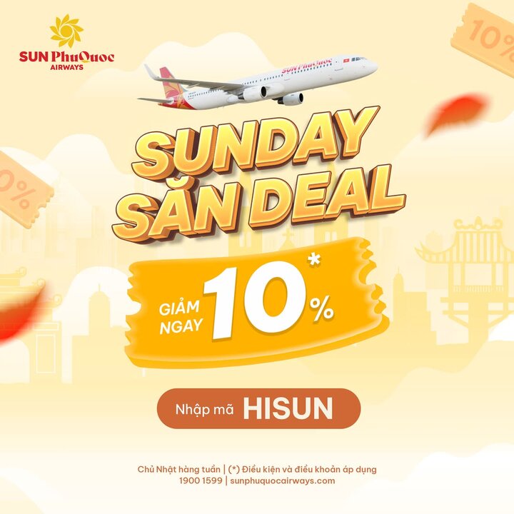 Sun PhuQuoc Airways cũng mang đến cơ hội “săn vé vàng” mỗi Chủ Nhật. Chỉ cần nhập mã “HISUN” vào Chủ Nhật hàng tuần, trong giai đoạn từ 15/10 đến hết 15/12/2025, hành khách sẽ được ưu đãi thêm 10% giá vé cơ bản trên mọi đường bay và hạng vé, áp dụng cho các chuyến bay khởi hành từ 1/11/2025 đến 28/3/2026. Với “Sunday Săn Deal”, mỗi cuối tuần trở thành cơ hội để lên kế hoạch cho hành trình bay – nghỉ dưỡng- vui chơi liền mạch, đầy tiện ích và vô cùng hấp dẫn.