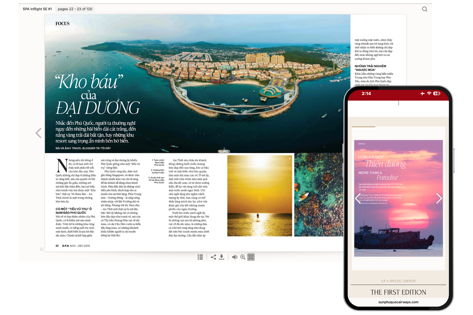 Trên hành trình đặc biệt này, Sun PhuQuoc Airways giới thiệu hai ấn phẩm song ngữ độc quyền – Tạp chí S.P.A và cẩm nang du lịch S.P.A Visit Phu Quoc, những người bạn đồng hành đầy cảm hứng, mang đến trải nghiệm khám phá và tận hưởng trọn vẹn dành cho những tâm hồn yêu du lịch.
