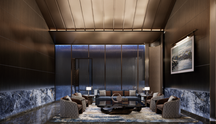 Khu vực chờ dành cho các đoàn quan chức cấp cao và nguyên thủ tiếp tục đưa trải nghiệm đi vào những tầng sâu nhất của đại dương. Tại đây, mọi xao động của thế giới bên ngoài dường như lắng lại sau những bức tường màu trầm. Bao quanh không gian là các bề mặt đá obsidian đen bóng điểm xuyết đường chỉ kim loại ánh vàng, tạo nên vẻ sang trọng kín đáo và đầy cuốn hút. Tâm điểm của khu vực là tác phẩm điêu khắc bằng thủy tinh và vàng treo lơ lửng, gợi hình ảnh cá đại bàng biển đang sải cánh tự do giữa lòng biển sâu.