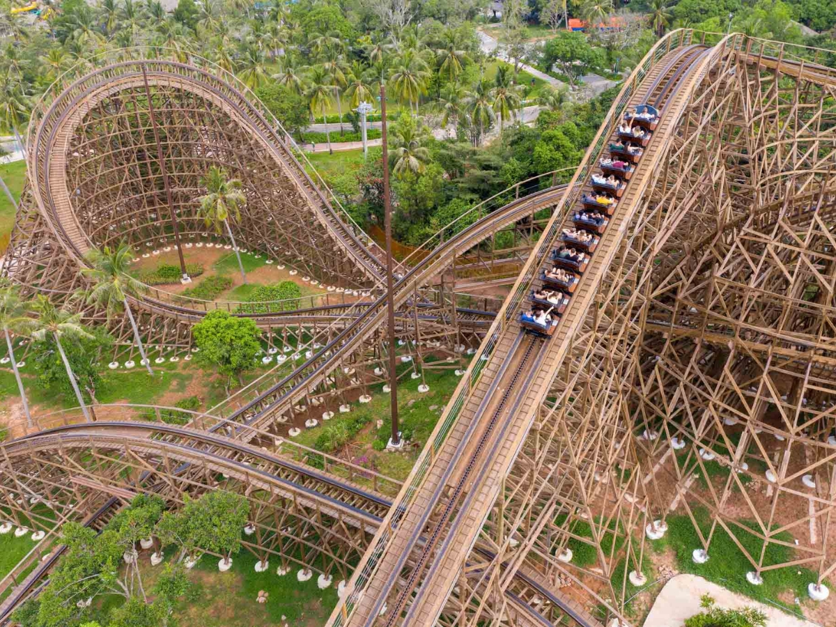 Du khách có thể thử sức với hàng loạt trò chơi mạo hiểm đầy thách thức, trong đó nổi bật nhất là tàu lượn gỗ Mộc Xà Thịnh Nộ. Con tàu khổng lồ lao vun vút trên đường ray gỗ uốn lượn giữa rừng cây, đưa người chơi trải qua những cú rơi tự do, khúc cua gắt và vòng xoắn ngoạn mục, mang đến cảm giác phấn khích tột độ. Ngoài ra, Mắt Đại Bàng – đài quan sát 360 với độ cao 120 m cũng là điểm đến ấn tượng, đưa du khách vút lên giữa không trung, chiêm ngưỡng toàn cảnh biển trời Nam đảo Phú Quốc hùng vĩ.