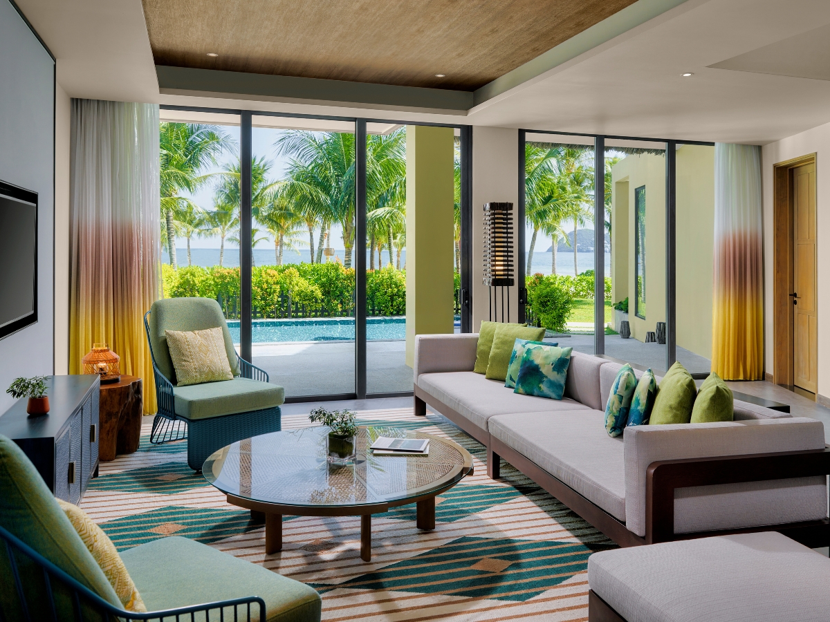 Không gian sinh hoạt mở gồm phòng khách, khu bếp và bàn ăn hiện đại, tạo cảm giác gần gũi như ở nhà nhưng vẫn toát lên vẻ thanh lịch đặc trưng của một khu nghỉ dưỡng cao cấp. Bên ngoài có hồ bơi riêng hướng biển cùng hàng ghế tắm nắng là nơi lý tưởng để thư giãn, tận hưởng tiếng sóng rì rào và khung cảnh hoàng hôn rực rỡ.
